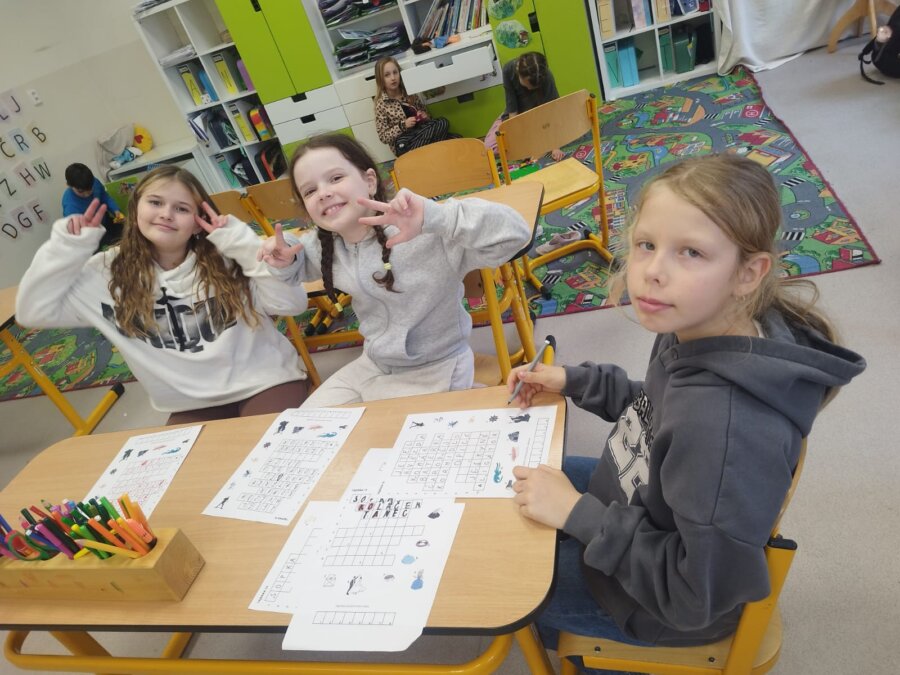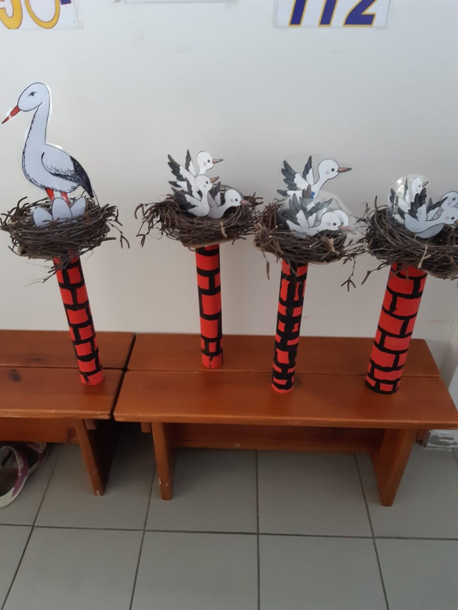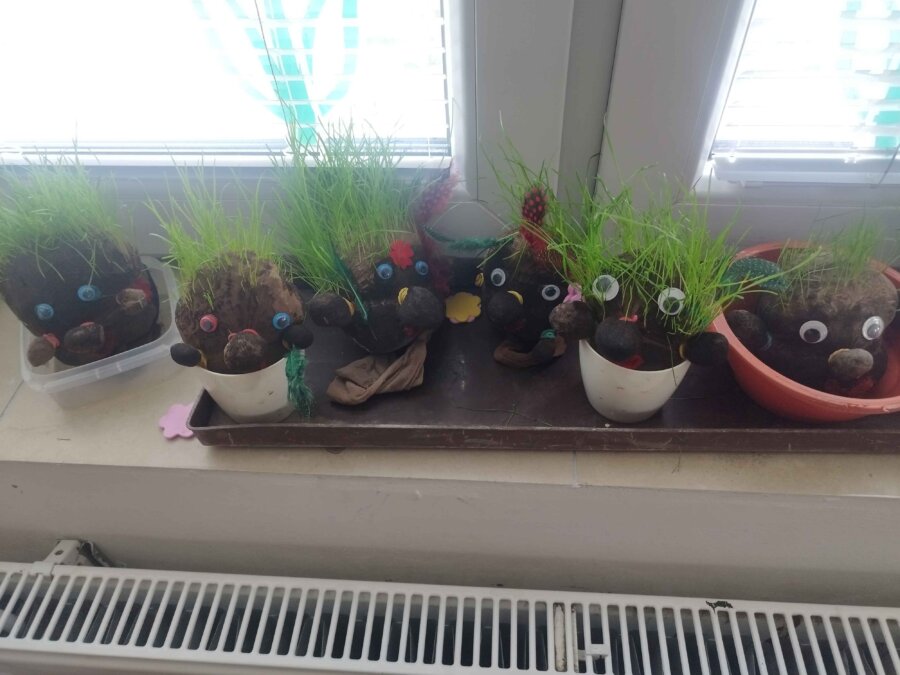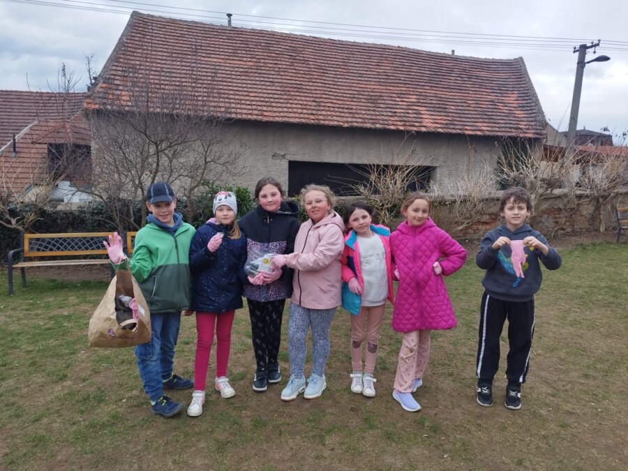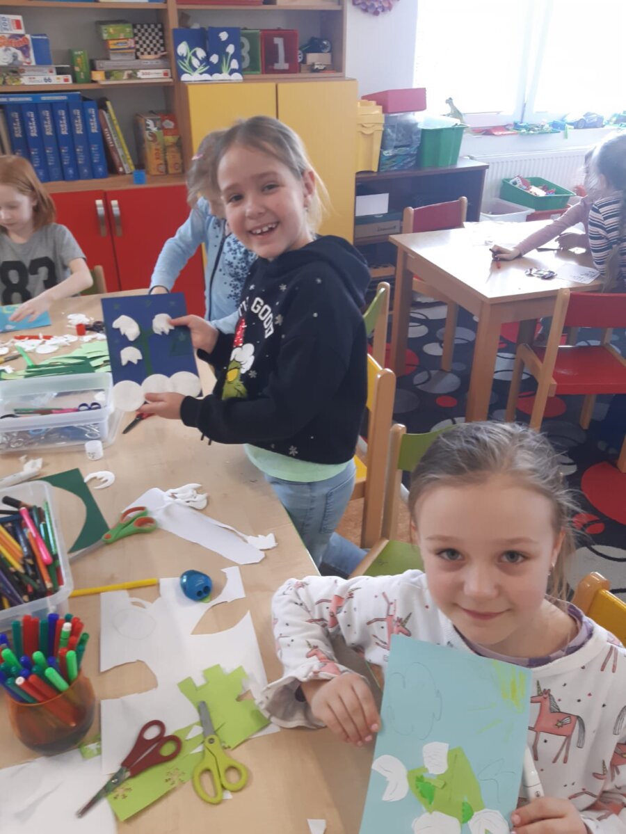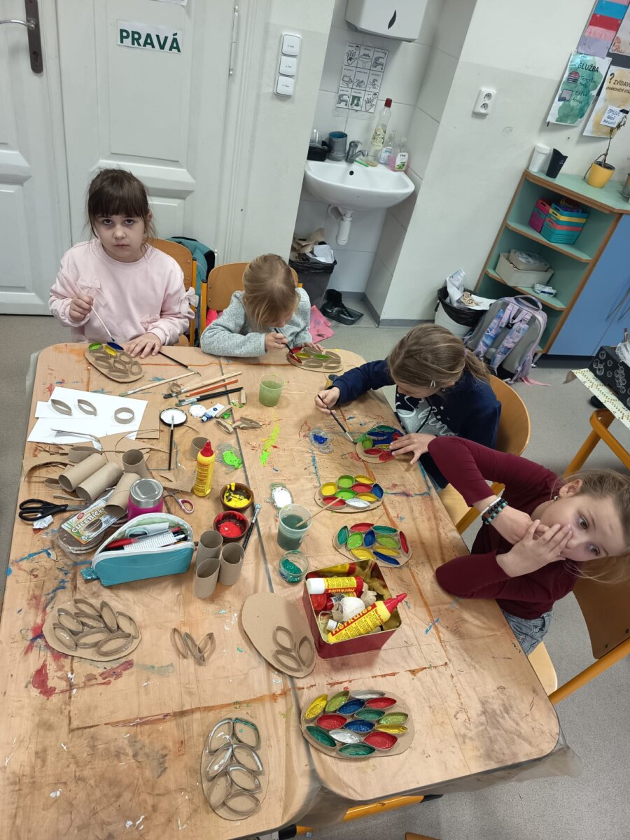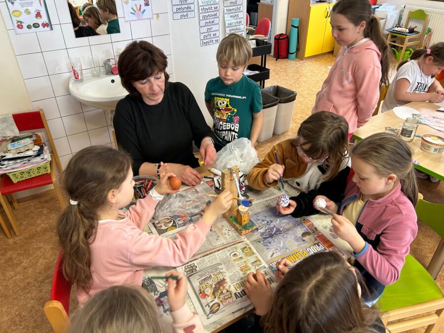 V družině si povídáme o probouzení přírody, o ptáčcích, kteří se k nám postupně vrací z teplých krajin. Vyrábíme čápům hnízda, učíme se názvy jarních kytiček. A chystáme se na Velikonoce. Družina je plná „trávovlasých“ skřítků, pestrobarevných kraslic malovaných voskem i fixami, veselých zajíčků a květin mnoha druhů. Z plat od vajec máme vyrobené krásné věnce. Připomínáme si velikonoční zvyky a luštíme jarní křížovky a osmisměrky.