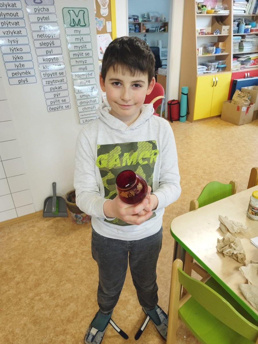 K jaru patří také úklid. Ne náhodou připadá na toto období akce „Ukliďme Česko“. I my chceme mít okolí školy, zahradu a hřiště hezké. A tak jedno odpoledne vyrážíme vybaveni rukavicemi a pytli s velkým odhodláním do terénu. A představte si, kromě mnoha odpadků někteří našli i úplný poklad: Matěj si domů na památku odnáší krásnou sklenku a Martínek zábavnou hračku. V družině ji pořádně umyje a je jako nová.