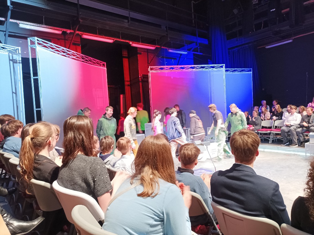 Představení se odehrávalo netradičně na točně jeviště. V průběhu hry mohli žáci diskutovat s herci, hlasovat a vstupovat do děje.