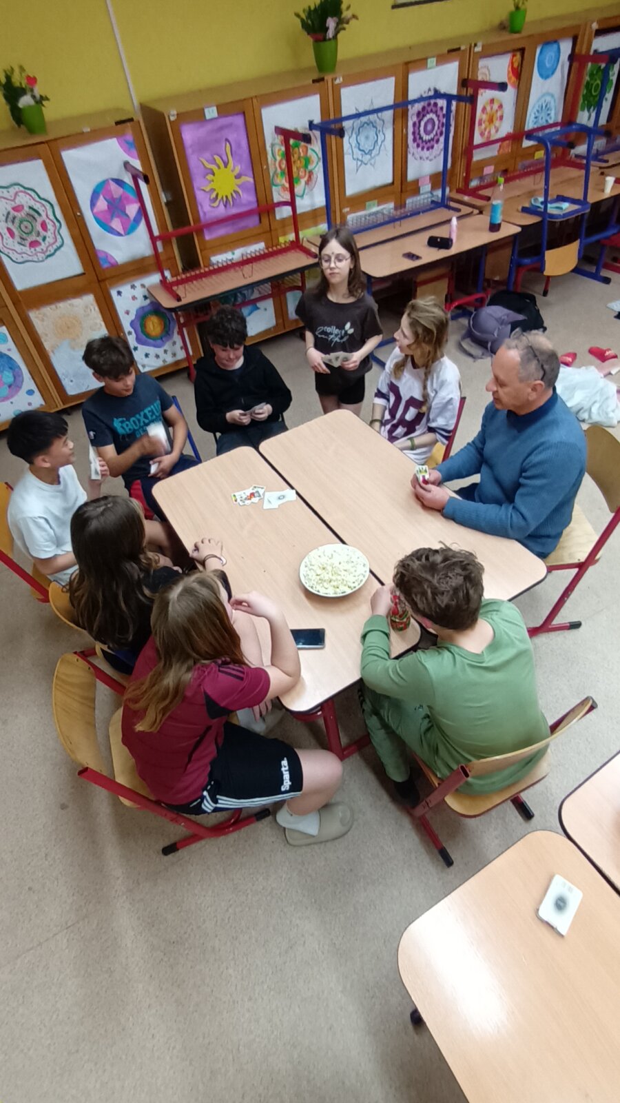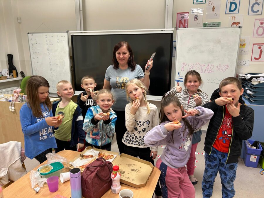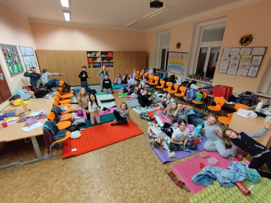 - Čtení, soutěže a stezky odvahy: Program je sice v každé škole a knihovně trochu jiný, ale trocha napětí a společného předčítání nesmí chybět. U nás děti soutěží v družstvech, která jsou poskládaná napříč ročníky, a řeší rébusy a hádanky na pohádková témata. Nechybí společné čtení, večerní předčítání, deskové hry ani společné stolování. Některé třídy si malují trička na památku nebo si dělají společnou hostinu.