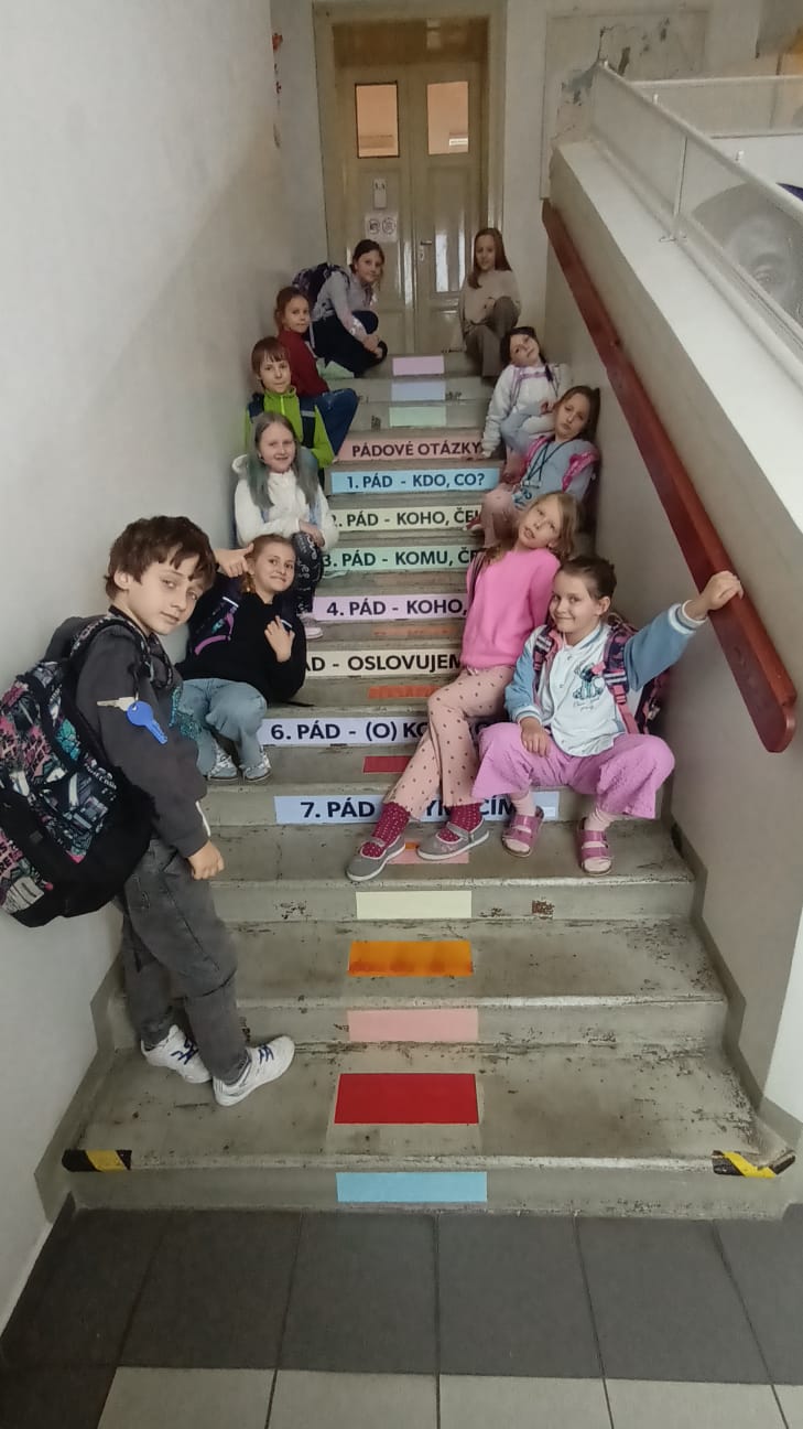 Polepy jsou zaměřené na češtinu – konkrétně na slovní druhy a pádové otázky. Děti si tak mohou základní učivo připomínat pokaždé, když jdou o přestávce nebo na hodinu po schodech.