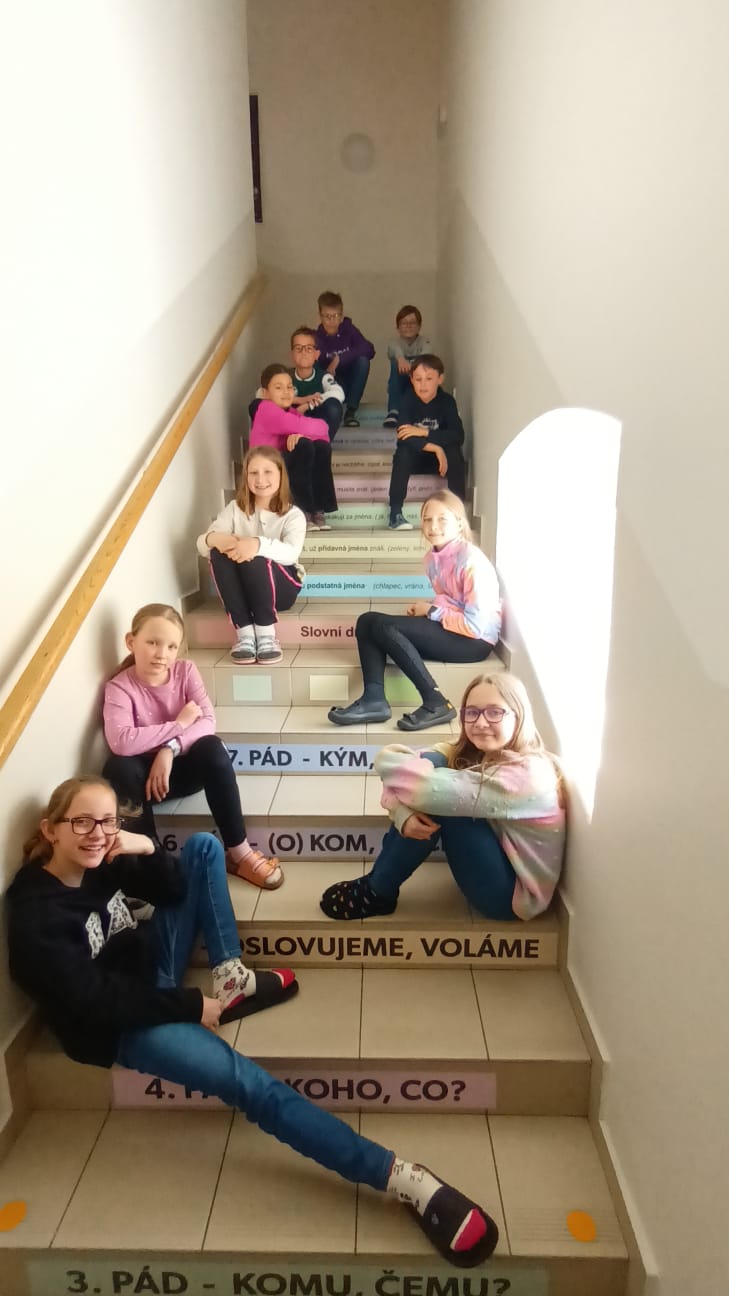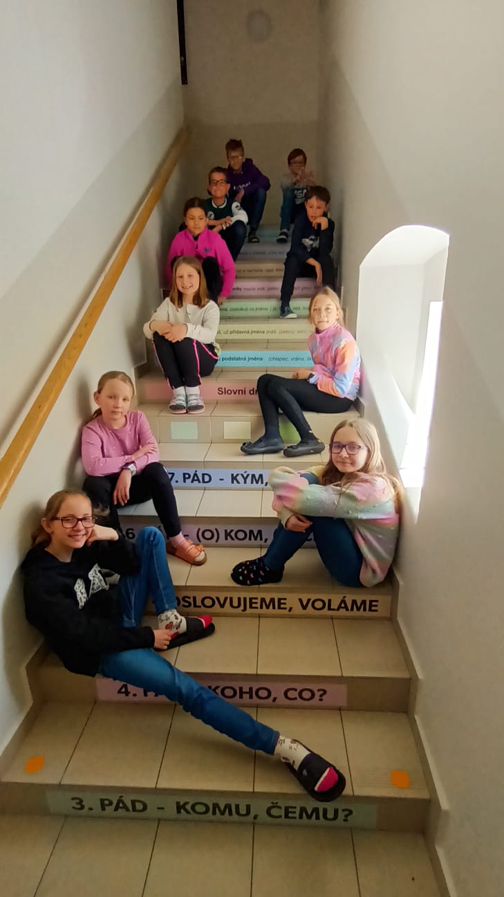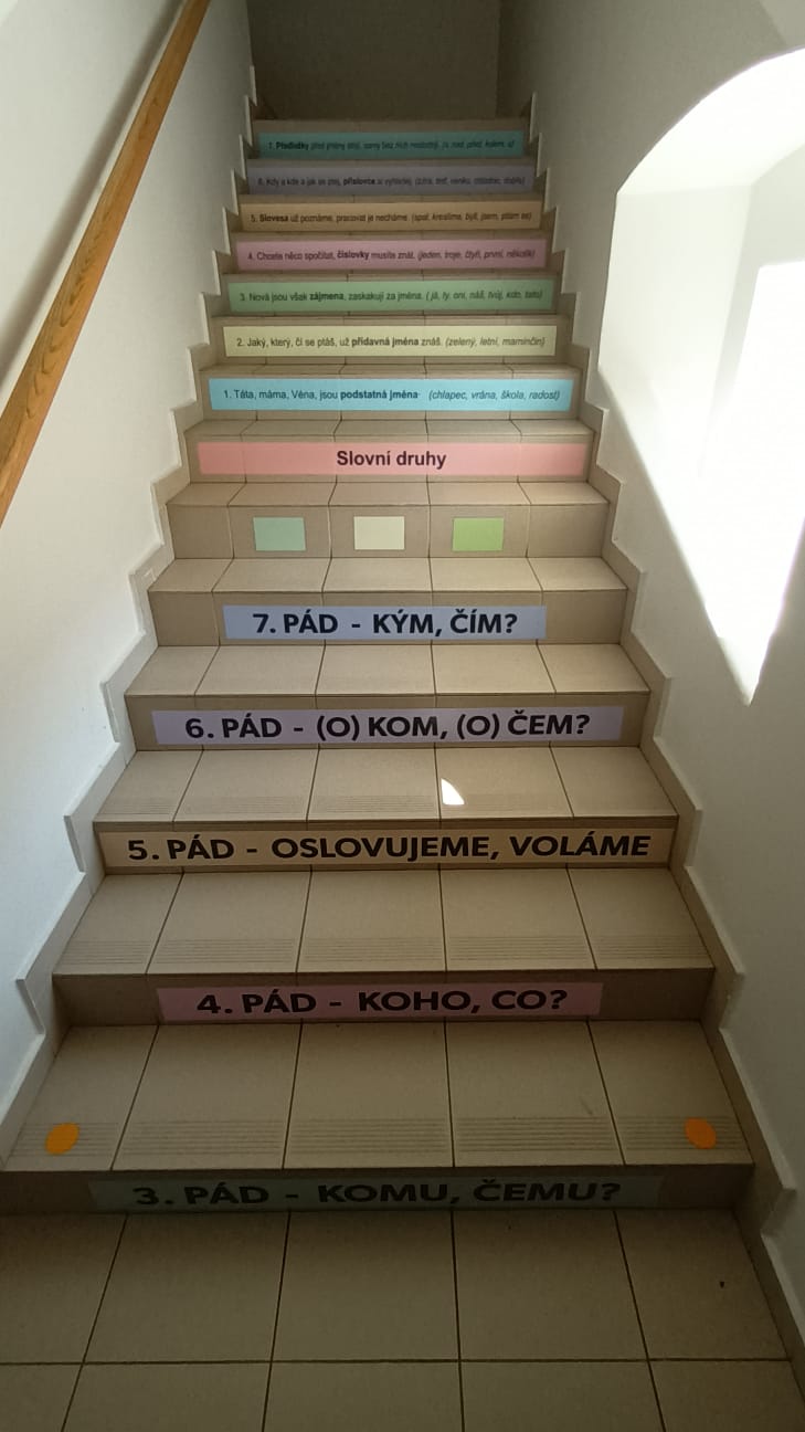 Polepy jsou zaměřené na češtinu – konkrétně na slovní druhy a pádové otázky. Děti si tak mohou základní učivo připomínat pokaždé, když jdou o přestávce nebo na hodinu po schodech.