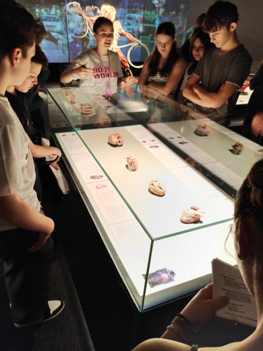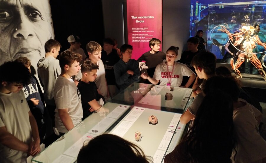 Výstavou nás provázela studentka medicíny a během prohlídky jsme měli možnost detailně si prohlédnout jednotlivé orgánové soustavy, například svalovou, trávicí, nervovou soustavu, a exponáty zobrazující jednotlivé orgány žákům pomohly lépe pochopit jejich stavbu i funkci.