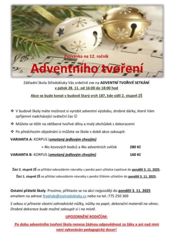 publikováno 22. 10. 2025Milí žáci a milí rodiče, srdečně vás zveme na každoroční zdobení adventních věnců. Podrobnosti viz obrázek, případně – klikni zde