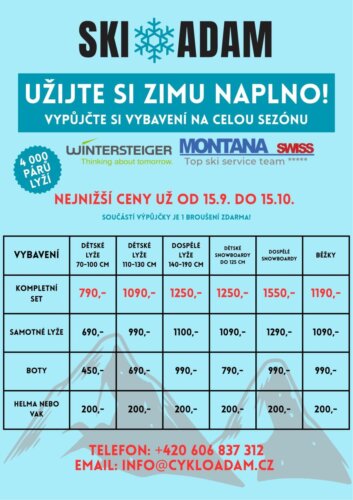 informujeme vás, že naše škola i v letošním roce spolupracuje s firmou Ski-cyklo Adam, která mimo jiné funguje jako půjčovna lyží a lyžařských setů. Pro žáky naší školy jsme u této firmy vyjednali, nejen pro účely lyžařského kurzu, slevu ve výši 10% na půjčení lyžařského vybavení. O slevu se při půjčování musíte vždy přihlásit.